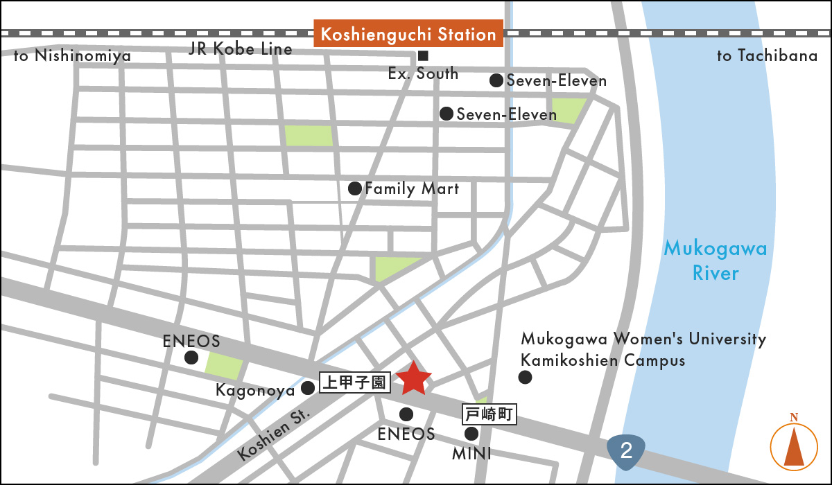 From JR "Tsukamoto" station, go straight west on Himejima-dori from the west exit.